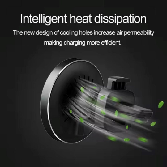 Q22 CAR Kvalitná hliníková výkonná bezdrôtová magnetická nabíjačka do auta s podporou Apple MagSafe. Vybavená držiakom do ventilácie, v atraktívnom čierno transparentnom dizajne.