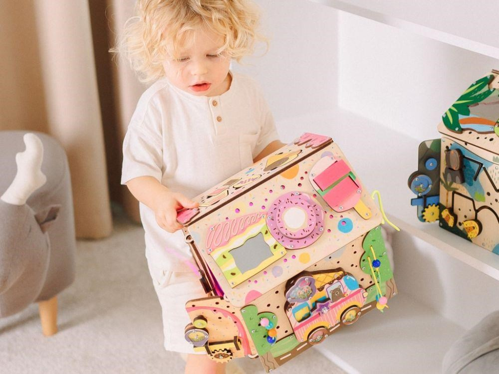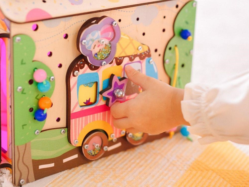 Originálny svietiaci domček activity board zavádza deti do fantastického sveta sladkostí. So zmrzlinovým autom, s mlsným medvedíkom a so striebrou montessori a hracích prvkov sa deti vydajú za sladkým dobrodružstvom, pri ktorom sa skvele zabavia a zdokonalia svoje zručnosti. Každá strana activity boardu je originálna a ponúka nespočet možností na hru. Acitivity board domček Cukrovinky je navyše svietiaci, po zapnutí svetla sa vo vnútri domčeka rozsvieti ružové svetlo.