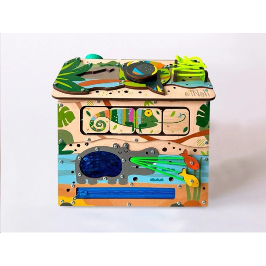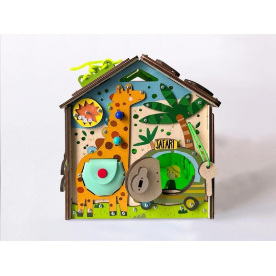 Domček activity board - Safari je tvorené zo šiestej dosky s hracími a montessori prvkami zameranými na zručnosť, logiku, kreativitu a trpezlivosť. Domček vtiahne deti do sveta objavovania a fantázie, kde si deti samé hrajú a učia sa tým najprirodzenejším spôsobom, pomocou hry.
