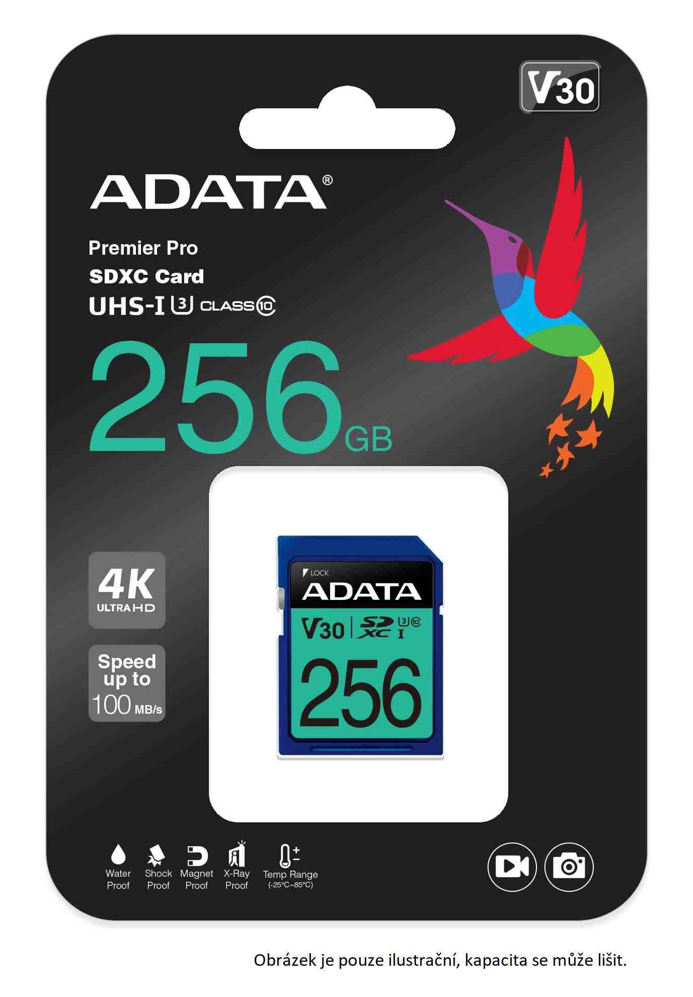 Rýchlosť čítania/zápisu kariet Premier Pro SDXC UHS-I U3 je až 100/80 MB za sekundu, čo skracuje čas úpravy a nahrávania súborov a vďaka vynikajúcemu výkonu podporuje režimy sériového snímania. Karty spĺňajú špecifikácie V30 (Video Speed Class), čo znamená, že môžu nahrávať až 30 MB videa za sekundu. To je viac než dosť na nahrávanie videí v rozlíšení Ultra HD 4K, ktoré sú vhodné najmä pre profesionálnych fotografov.