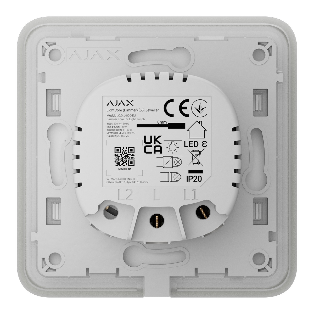 Ajax LightSwitch Dimmer Jeweller je chytrý dotykový nástenný stmievč pre osvetlenie určený na vnútornú inštaláciu.