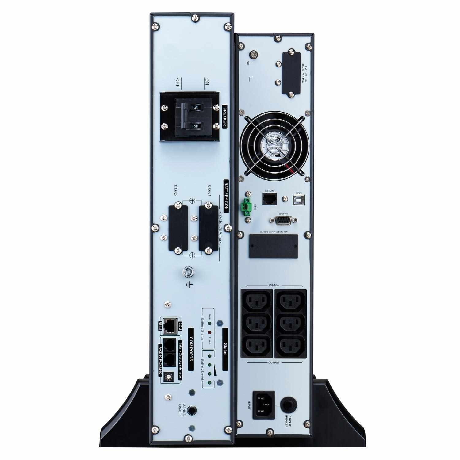 | Dodávka obsahuje | Základný kábel pre komunikáciu záložného zdroja cez rozhranie RS-232, Kábel USB, Kábel RJ45, Kábel RJ11, Napájací kábel C13-C14, Skriňové inštalačné konzoly, Skriňové podperné lišty, Stabilizačné nohy, Užívateľská príručka, Bezpečnostná príručka, Battery cable |