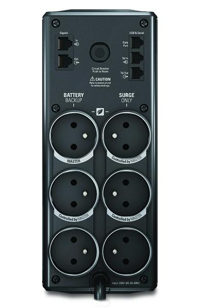 | Typ zásuviek | RJ-11 In/Out RJ45 Base-T Ethernet (3) francúzsky/belgický (výstup - záložná prevádzka na batérie) (3) francúzsky/belgický (výstup - prepäťová ochrana) na ochranu laserových tlačiarní, skenerov alebo iných zariadení s vysokým výkonom |
