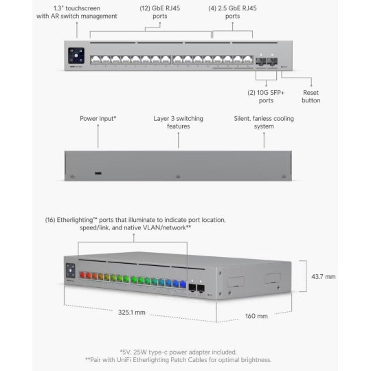 Popis produktu Ubiquiti Pro Max 16 je novým L3 switchem, který nabízí 4x 2.5 Gbps a 12x 1 Gbps porty. Pro připojení pomocí optického rozhraní jsou připraveny 2 SFP+ porty dosahující rychlosti až 10 Gb/s. Switch je napájen přes USB-C konektor 5V DC 25W. Etherlighting technologie Switch podporuje technologii Etherlighting, která umožňuje barevně indikovat lokaci portu, linkovou rychlost, nadefinované typy zařízení, PoE status nebo barevně odlišit jednotlivé VLAN. *pro správnou funkci je doporučeno použít Ubiquiti UniFi Etherlighting Patch kabely Správa přes UniFi Controller Switch nemá webový management, ale je spravován centrálně pomocí UniFi Controlleru s podporou mobilní aplikace UniFi a nabízí rozsáhlou sadu pokročilých přepínacích protokolů a funkcí L2, včetně provozního režimu (přepínání, zrcadlení nebo agregace) na port. UniFi Network Controller a mobilní aplikace umožňují správcům konfigurovat a sledovat prakticky všechny funkce přepínače v grafickém uživatelském rozhraní odkudkoli. Obsah balení • Zařízení • Napájecí DC adaptér • Montážní set Kontakt: Ubiquiti International Holding B.V. Ekkersrijt 3102, 5692 CC Son en Breugel support@ui.com Technická podpora k tomuto produktu je dostupná na emailu rma@discomp.cz, telefonním čísle (+420) 377 477 794, případně odesláním dotazu přes webový formulář. Naše technická podpora je dostupná v této pracovní době. Obchodní informace Dan Pacanda, +420 370 380 965 , dan.pacanda@discomp.cz Technické parametry Konektory a rozhraní Rychlost LAN:(12) 10/100/1000Mbps + (4) 10/100/2500Mbps Optické rozhraní:(2) 1G/10Gbps Ostatní:Dotykový displej Napájení Typ napájení:USB-C Max. spotřeba energie [W]:25 Napájení přes konektor/svorkovnici:5V DC Fyzické charakteristiky Provedení:Na zeď, Desktop, Rackmount Ventilátory:Ne Šasi:Kovové Tlačítka:Reset Provozní teplota [°C]:-5 až 40 Šířka [mm]:325 Výška [mm]:44 Hloubka [mm]:160 Obecné Rychlost přepínání [Gbps]:84 Rychlost předávání paketů [Mpps]:62 Software Management:UniFi Network Funkce:VLAN, DHCP snooping, L3 Výchozí IP adresa:Dynamická z DHCP.