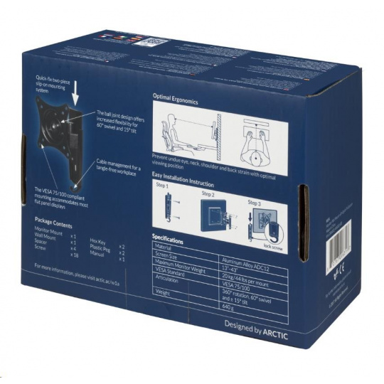 ARCTIC W1A je jednootáčkový držiak s 3-osovým kĺbom, ktorý ponúka plynulé nastavenie uhla obrazovky s 360° rotáciou, 60° otočením a ±15° náklonom. Konštrukcia s guľovým kĺbom poskytuje flexibilitu na dokonalé umiestnenie monitora, aby sa znížilo namáhanie očí, krku, ramien a chrbta. Pripevňuje sa tesne k stene a maximalizuje pracovnú plochu. Dvojdielny systém priamej montáže, ktorý je kompatibilný s monitormi s uhlopriečkou od 13" do 43", umožňuje rýchlu inštaláciu a podporuje hmotnosť až do 20 kg.