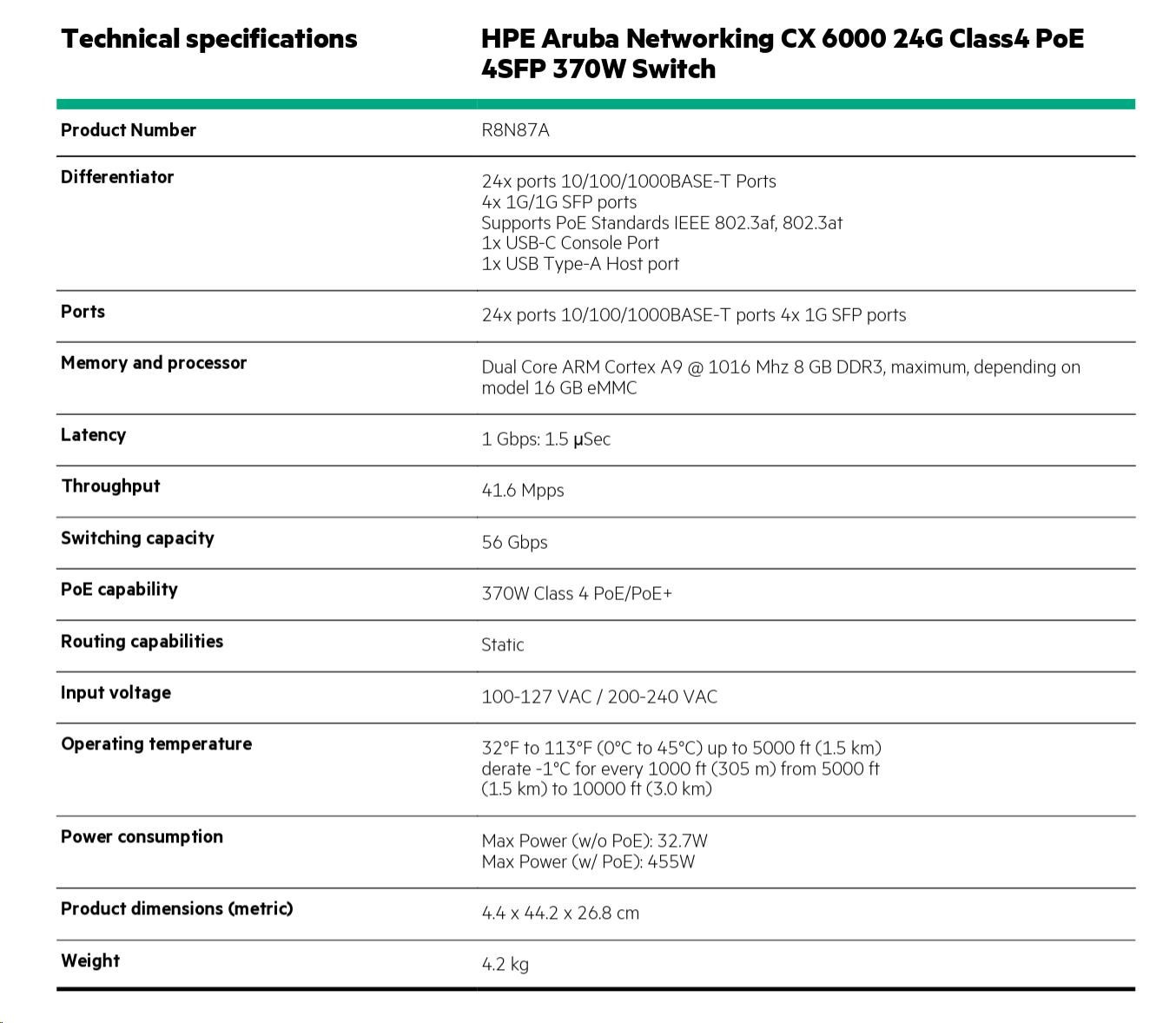 Aruba 6000 48G Class4 PoE 4SFP 370W Switch (R8N85A)
