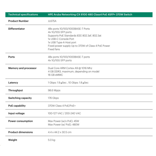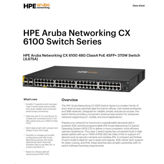 Aruba 6100 48G Class4 PoE 4SFP+ 370W Switch (JL675A))