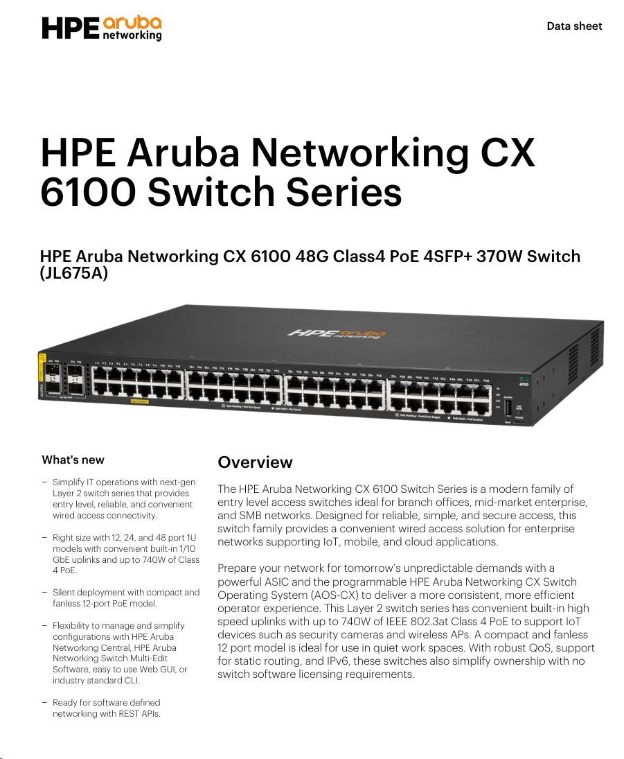 Aruba 6100 48G Class4 PoE 4SFP+ 370W Switch (JL675A))