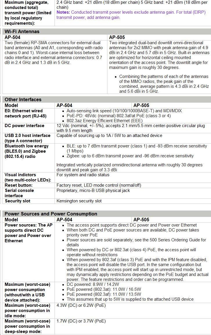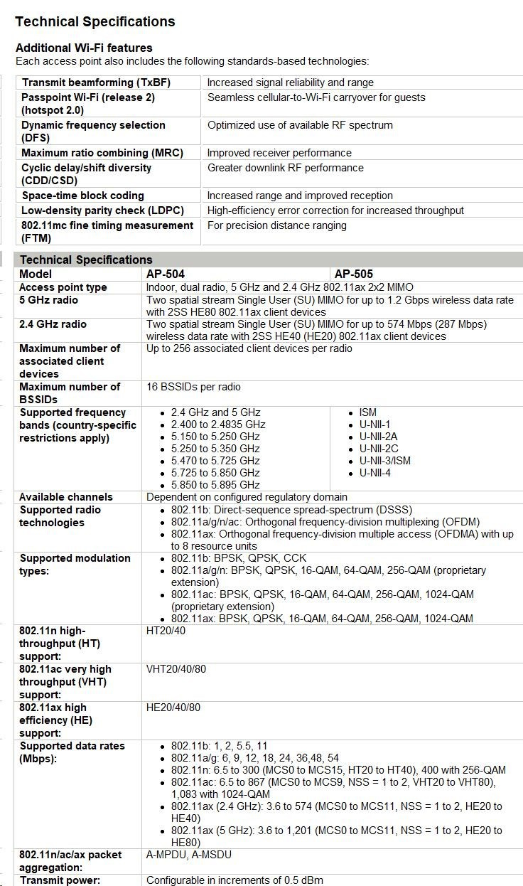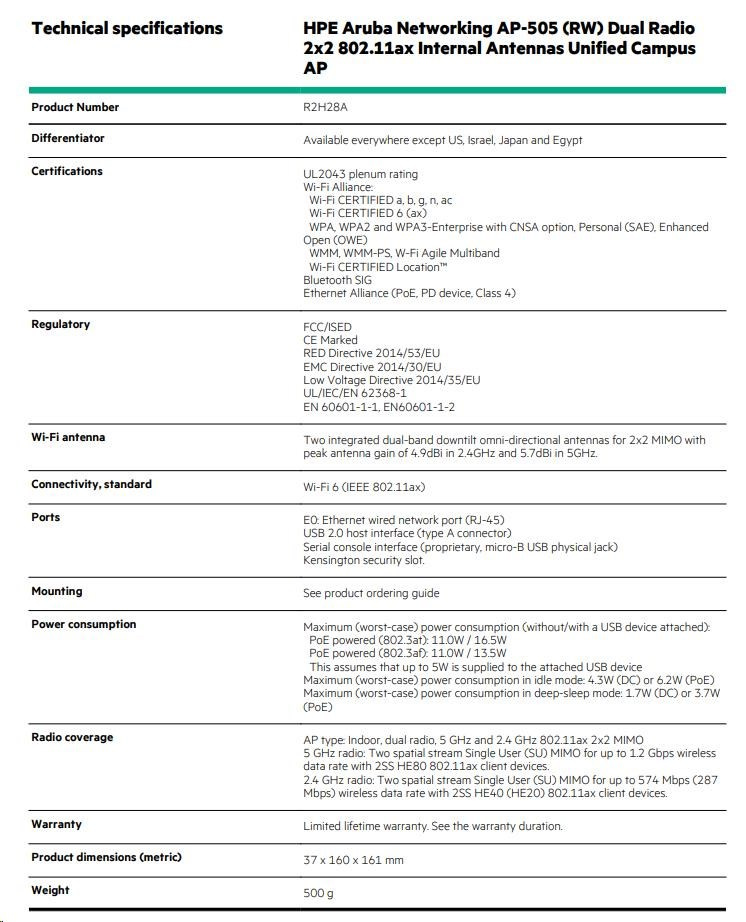 Technical specifications HPE Aruba Networking AP-505 (RW) Dual Radio 2x2 802.11ax Internal Antennas Unified Campus AP Product Number R2H28A Differentiator Available everywhere except US, Israel, Japan and Egypt Certifications UL2043 plenum rating Wi-Fi Alliance: Wi-Fi CERTIFIED a, b, g, n, ac Wi-Fi CERTIFIED 6 (ax) WPA, WPA2 and WPA3-Enterprise with CNSA option, Personal (SAE), Enhanced Open (OWE) WMM, WMM-PS, W-Fi Agile Multiband Wi-Fi CERTIFIED Location™ Bluetooth SIG Ethernet Alliance (PoE, PD device, Class 4) Regulatory FCC/ISED CE Marked RED Directive 2014/53/EU EMC Directive 2014/30/EU Low Voltage Directive 2014/35/EU UL/IEC/EN 62368-1 EN 60601-1-1, EN60601-1-2 Wi-Fi antenna Two integrated dual-band downtilt omni-directional antennas for 2x2 MIMO with peak antenna gain of 4.9dBi in 2.4GHz and 5.7dBi in 5GHz. Connectivity, standard Wi-Fi 6 (IEEE 802.11ax) Ports E0: Ethernet wired network port (RJ-45) USB 2.0 host interface (type A connector) Serial console interface (proprietary, micro-B USB physical jack) Kensington security slot. Mounting See product ordering guide Power consumption Maximum (worst-case) power consumption (without/with a USB device attached): PoE powered (802.3at): 11.0W / 16.5W PoE powered (802.3af): 11.0W / 13.5W This assumes that up to 5W is supplied to the attached USB device Maximum (worst-case) power consumption in idle mode: 4.3W (DC) or 6.2W (PoE) Maximum (worst-case) power consumption in deep-sleep mode: 1.7W (DC) or 3.7W (PoE) Radio coverage AP type: Indoor, dual radio, 5 GHz and 2.4 GHz 802.11ax 2x2 MIMO 5 GHz radio: Two spatial stream Single User (SU) MIMO for up to 1.2 Gbps wireless data rate with 2SS HE80 802.11ax client devices. 2.4 GHz radio: Two spatial stream Single User (SU) MIMO for up to 574 Mbps (287 Mbps) wireless data rate with 2SS HE40 (HE20) 802.11ax client devices. Warranty Limited lifetime warranty. See the warranty duration. Product dimensions (metric) 37 x 160 x 161 mm Weight 500 g