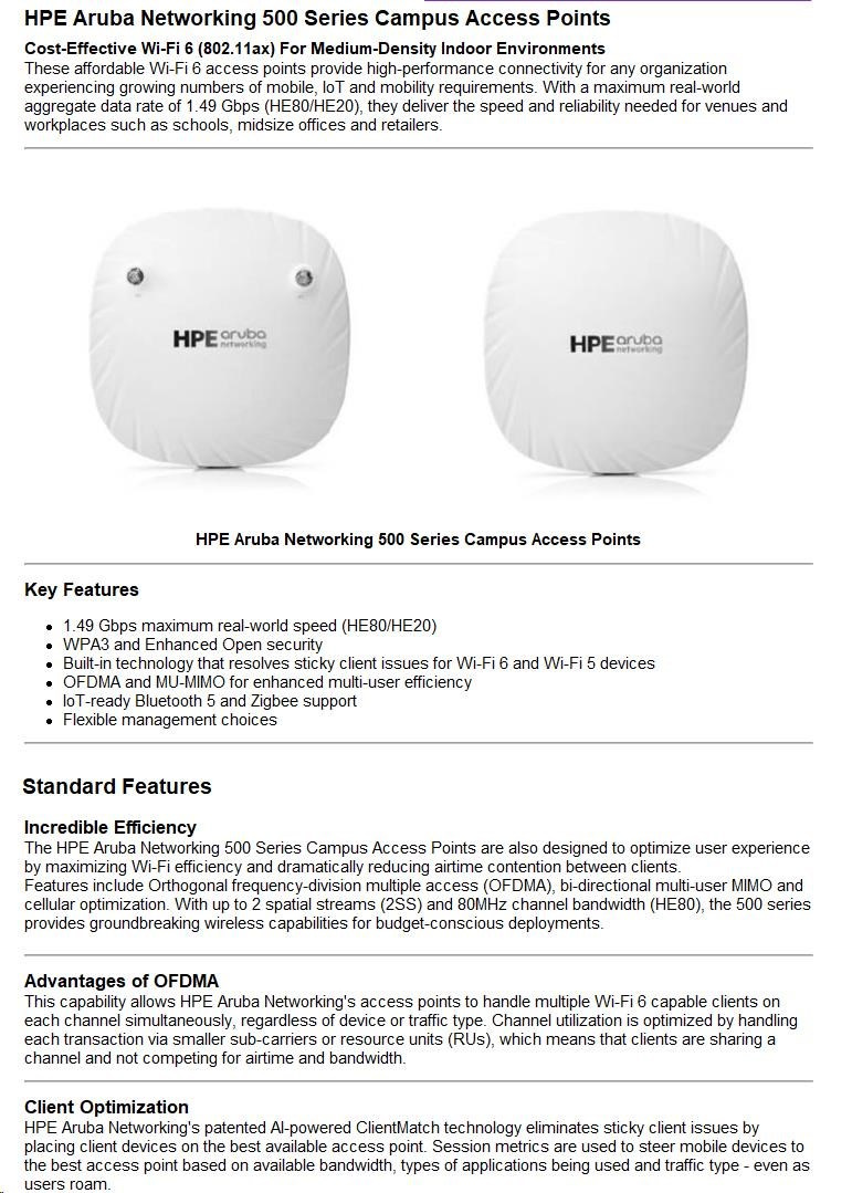 The HPE Aruba 500 Series delivers affordable, high-performance Wi-Fi 6 for schools, midsize offices, and retailers. With up to 1.49 Gbps real-world speed, it supports mobile, IoT, and demanding user needs.