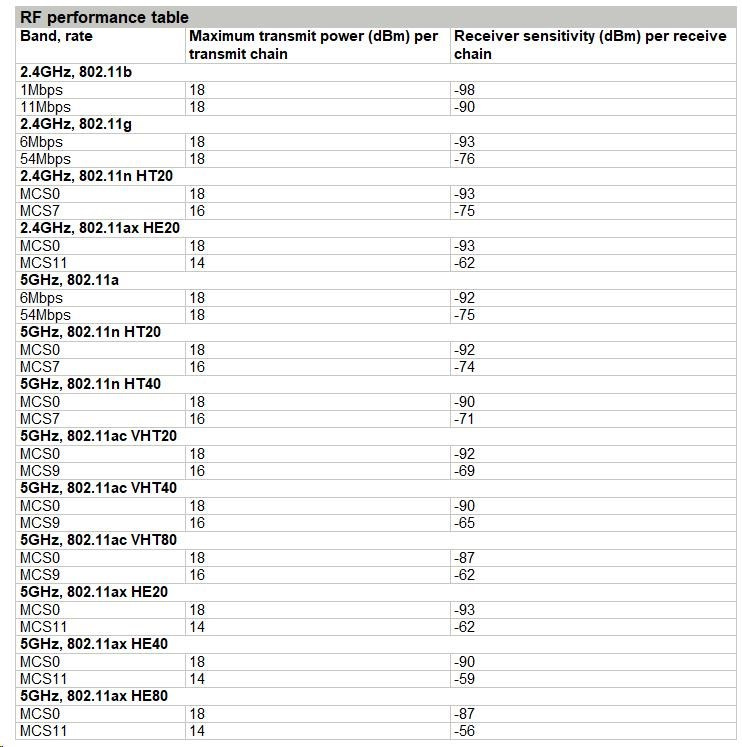 • Wi-Fi Standards: 802.11a/b/g/n/ac/ax