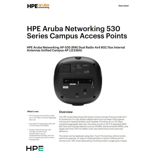 | Very High Wi-Fi 6 (802.11ax) Performance With Dual Radios And Green AP Energy Efficiency Aruba Wi-Fi 6 access points provide high-performance connectivity for any organization experiencing growing numbers of IoT and mobility requirements. With a maximum aggregate data rate of 3.55 Gbps (HE80/HE40), the Aruba 530 Series deliver the speed and reliability needed for any enterprise. | |
