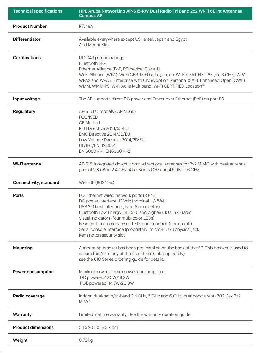Aruba AP-615 (RW) TAA Dual-radio Tri-band 2x2:2 802.11ax Wi-Fi 6E Internal Antennas Campus AP