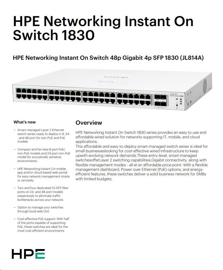 | Aruba Instant On 1830 8G Switch (JL810A) | Aruba Instant On 1830 8G 4p Class4 PoE 65W Switch (JL811A) | Aruba Instant On 1830 24G 2SFP Switch (JL812A) | Aruba Instant On 1830 24G 12p Class4 PoE 2SFP 195W Switch (JL813A) | Aruba Instant On 1830 48G 4SFP Switch (JL814A) | Aruba Instant On 1830 48G 24p Class4 PoE 4SFP 370W Switch (JL815A) | ||||