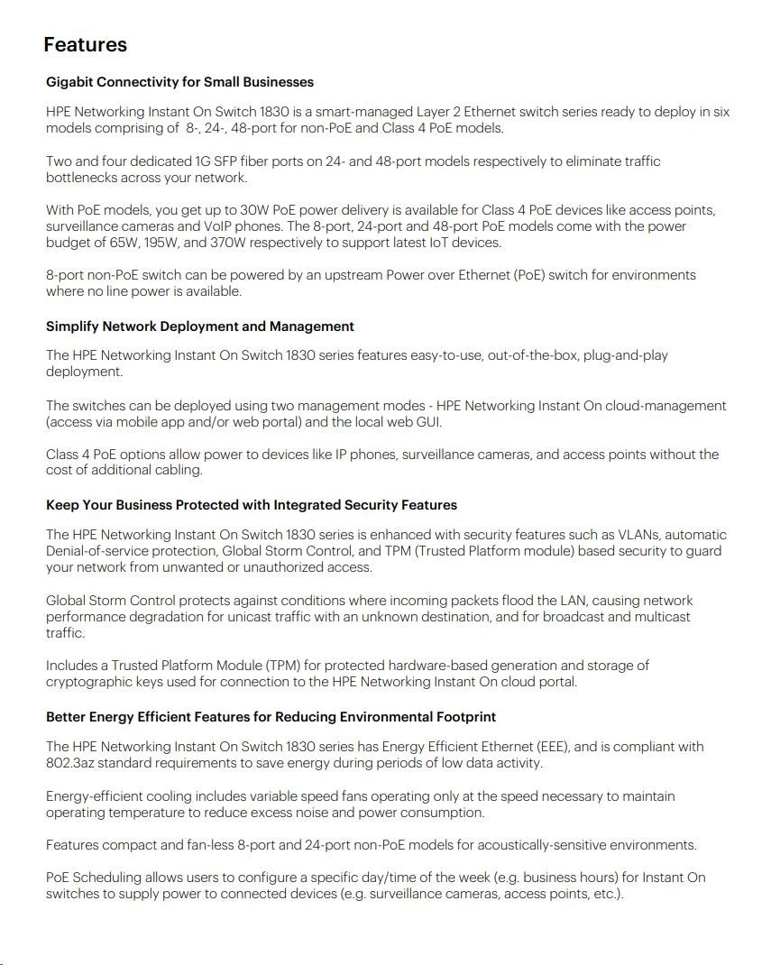| Aruba Instant On 1830 8G Switch (JL810A) | Aruba Instant On 1830 8G 4p Class4 PoE 65W Switch (JL811A) | Aruba Instant On 1830 24G 2SFP Switch (JL812A) | Aruba Instant On 1830 24G 12p Class4 PoE 2SFP 195W Switch (JL813A) | Aruba Instant On 1830 48G 4SFP Switch (JL814A) | Aruba Instant On 1830 48G 24p Class4 PoE 4SFP 370W Switch (JL815A) | ||||||||