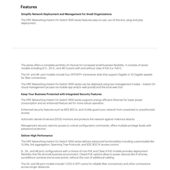 The Aruba Instant On 1930 switches features advanced, smart-managed, fixed- configuration Gigabit switches designed for small businesses that are easy-to-deploy and affordable. They're made to handle today's bandwidth-heavy applications like voice and video conferencing, enabling consistent connectivity to enhance performance.