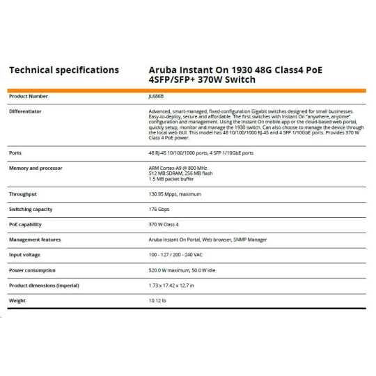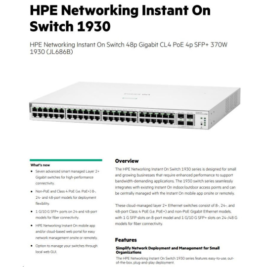 | Aruba Instant On 1930 48G Class4 PoE 4SFP/SFP+ 370W Switch (JL686B) | ||