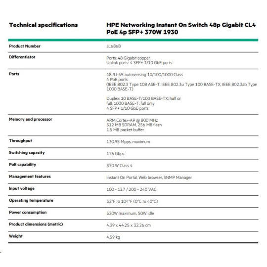 HPE Networking Instant On Switch 48p Gigabit CL4 PoE 4p SFP+ 370W 1930 (JL686B)