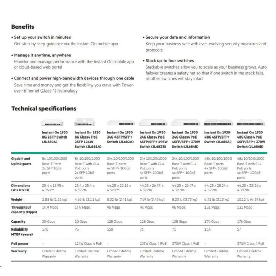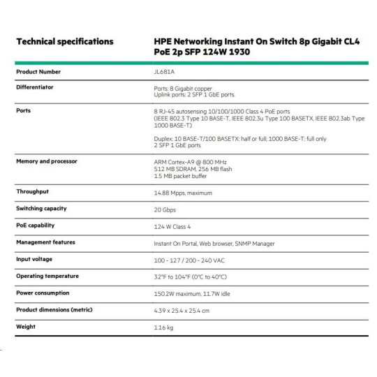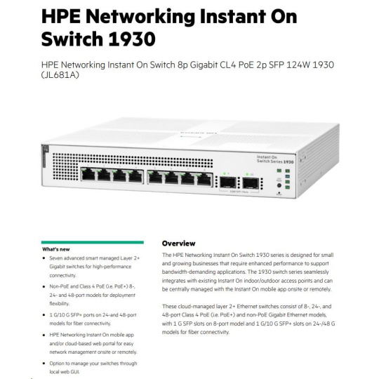 HPE Networking Instant On Switch 8p Gigabit CL4 PoE 2p SFP 124W 1930 (JL681A)