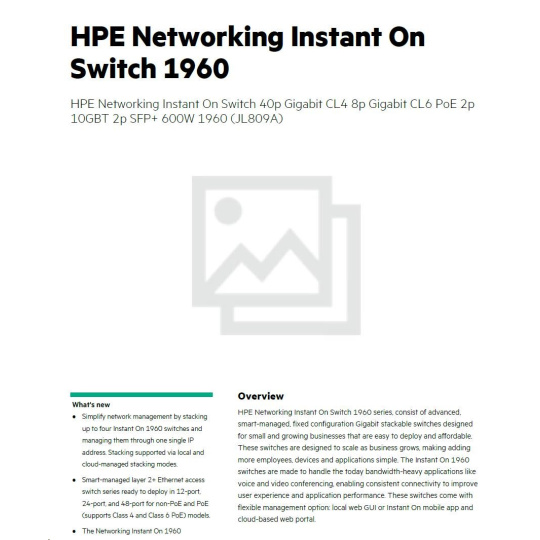 HPE Networking Instant On Switch 40p Gigabit CL4 8p Gigabit CL6 PoE 2p 10GBT 2p SFP+ 600W 1960 (JL809A)