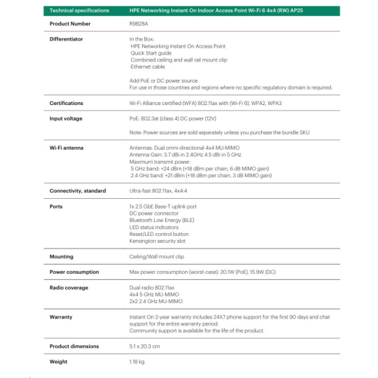 HPE Networking Instant On Indoor Access Point AP25 (Wi-Fi 6 4x4 RW R9B28A)