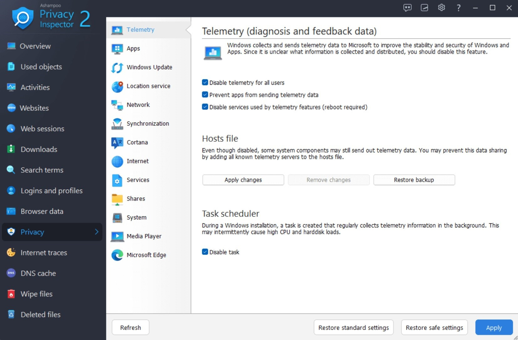 V sekcii Ochrana osobných údajov nájdete množstvo nových nastavení, ktoré vám umožňujú nakonfigurovať Windows, aplikácie a prehliadače tak, aby boli bezpečnejšie a diskrétnejšie. Vylepšený bol aj nástroj Internet Cleaner: Odstránené položky sa teraz zobrazujú v histórii a najnovšie verzie prehliadača sú optimálne podporované. Novinkou je aj funkcia File Wiper, ktorá umožňuje natrvalo odstrániť citlivé údaje a priečinky. Tieto súbory nie je možné obnoviť ani pomocou špecializovaného softvéru, takže vaše súkromie zostáva nedotknuté!