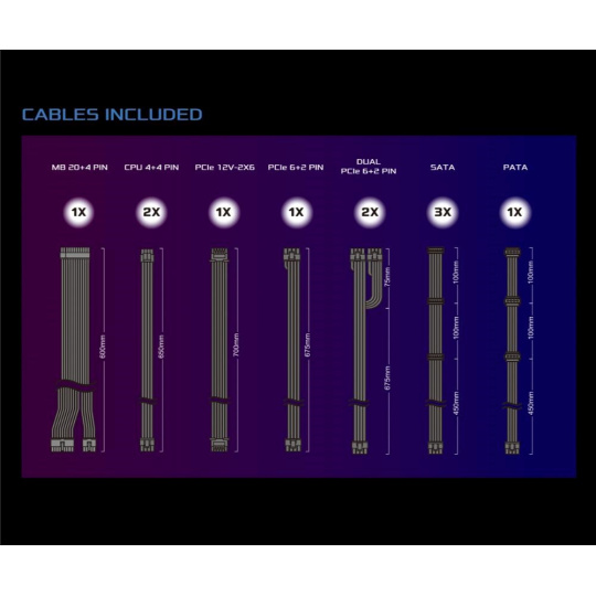| Dual PCIe 6+2 Pin Konektor | 2x / 2x (675 + 75 mm) |