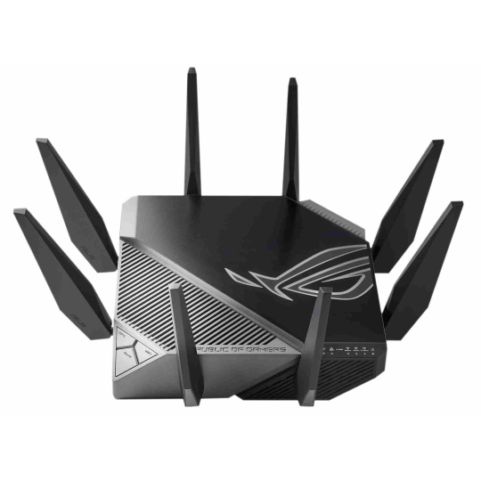 ROG Rapture GT-AXE11000 Trojpásmový herný router GT-AXE11000 WiFi 6E (802.11ax), nové pásmo 6 GHz, 2.port 5G WAN/LAN, kompatibilita s PS5, agregácia WAN, VPN Fusion, trojúrovňová akcelerácia hier, bezplatné zabezpečenie siete a podpora AiMesh Štandard WiFi novej generácie - prvý trojpásmový router WiFi 6E na svete zvyšuje rýchlosť až na 11 000 Mb/s. Nové pásmo 6 GHz - širšie kanály a vyššia kapacita prinášajú vyšší výkon, nižšiu latenciu a menej rušenia. 2.5G WAN/LAN Port - Všetka sieťová prevádzka prechádzajúca cez 2.port 5G má najvyššiu prioritu a 2.port 5G tak môže naplno využiť potenciál WiFi 6. Výkon vďaka špičkovej technológii - štvorjadrový procesor, pokročilý systém chladenia a optimalizovaný dizajn antény posúvajú výpočtové možnosti na úplne novú úroveň. Trojúrovňová akcelerácia hry - zrýchlenie herných dát na každej zastávke od zariadenia až po herný server. RJ45 pre Gigabits BaseT pre WAN x 1, RJ45 pre Gigabits BaseT pre LAN x 4, RJ45 pre 2.5G BaseT pre WAN/LAN x 1 ROG Rapture Wifi 6 802.11ax Trojpásmový gigabitový herný router Wifi 6 802.11ax 1148Mbps (2.4G) Wifi 6 802.11ax 4804Mbps (5GHz) Wifi 6E 802.11ax 4804Mbps (6GHz) OFDMA + MU-MIMO, 1024 QAM, trojúrovňová akcelerácia hier, osvetlenie Aura RGB, ROG Boost Key, 2.5G Multi-Gigabit Gaming Port, WiFI Radar a Zero Wait DFS, AiProtection Pro, VPN Fusion Adaptive QoS, Bandwidth control, AiMesh, ASUS Roter APP (ROG theme)..