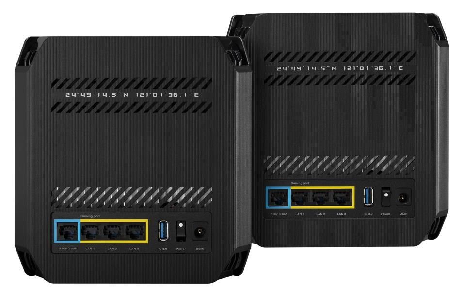 ROG Rapture Wifi 6 802.11ax Tri-band Gigabit Gaming Mesh System Wifi 6 802.11ax 574Mbps (2.4G) Wifi 6 802.11ax 4804Mbps (5GHz-1) Wifi 6 802.11ax 4804Mbps (5GHz-2) Data rate: 10000Mbps Whole home mesh wifi system for large and multi-story homes Supports flexible SSID setting, wired inter-router connections OFDMA + MU-MIMO tech, 1024 QAM, 2.5G WAN port, Triple level Game Acceleration, Aura RGB lighting, AiProtection Pro, VPN Fusion, Instand Guard Adaptive QoS, Bandwidth control, AiMesh, ASUS Roter APP (ROG theme).