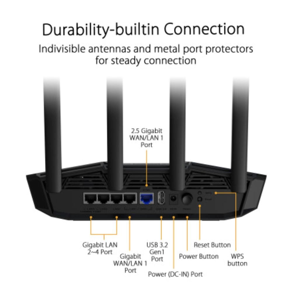 | Zabezpečení | AiProtection, VPN, podpora WPS, WPA/WPA2/WPA3-Personal, WPA/WPA2-Enterprise, WPS, Let's Encrypt, DNS-over-TLS, SSH, bezpečnostní skenování, firewall, • Maximální počet klíčových slov pro filtr firewallu: 64, • Maximální počet síťových služeb pro filtr firewallu: 32, • Maximální počet URL adres pro filtr firewallu: 64 |