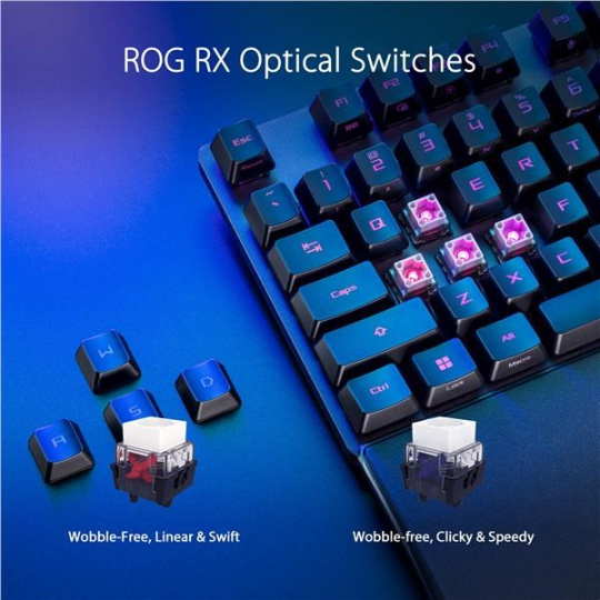 - Mechanické spínače ROG NX Snow & Storm: Predom namazané lineárne spínače NX Snow a klikacie spínače ROG NX Storm so stĺpovou konštrukciou na zvýšenie stability úderu a ladené pre vynikajúcu akustiku