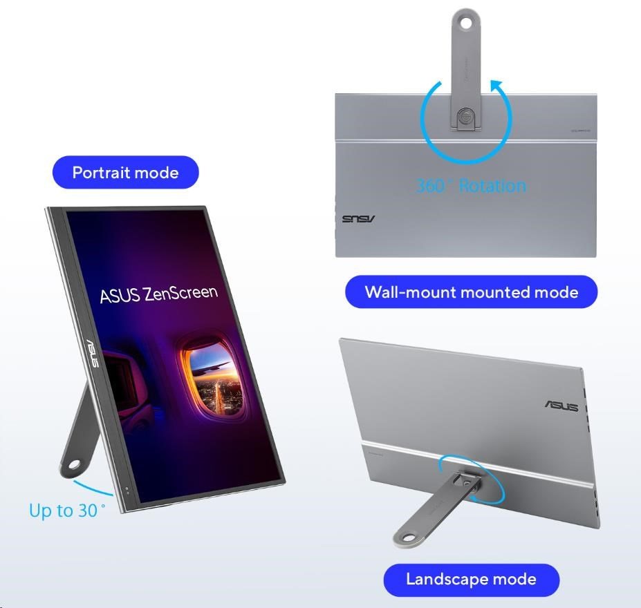 Prenosný monitor ASUS ZenScreen OLED MQ16AHE – 16" (15,6") FHD (1920 x 1080), OLED, 100% DCI-P3, Doba odozvy 1 ms, HDR-10, USB Type-C, Mini HDMI, Senzor priblíženia, 360° stojan, Bez blikania, Low Blue Light