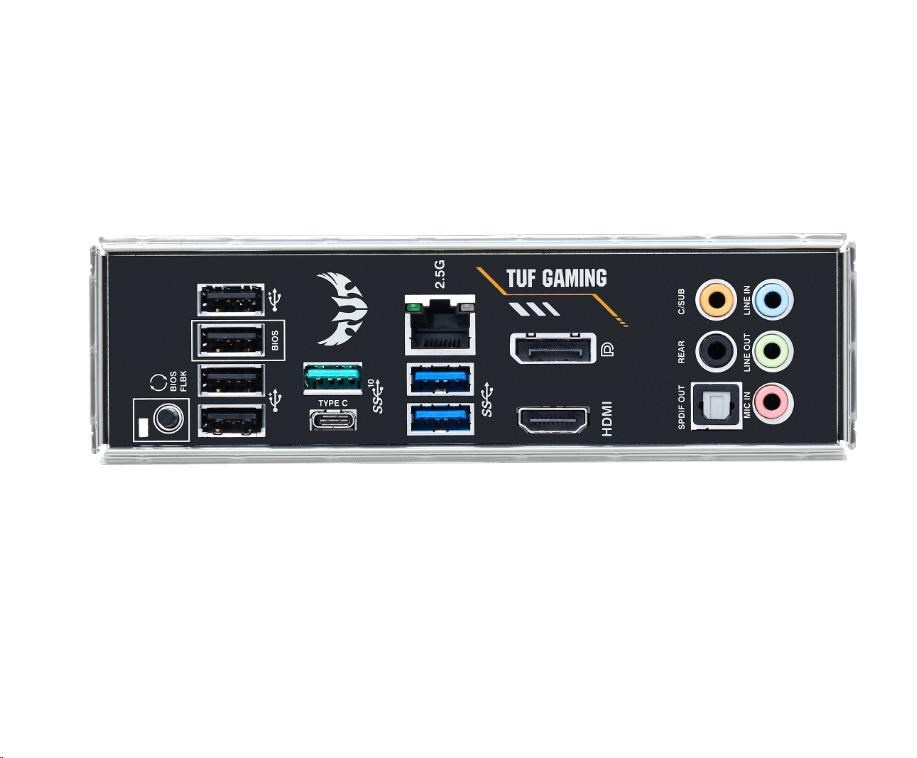 | zadné I/O porty | 1 x DisplayPort 1 x HDMI 1 x LAN (2.5G) 2 x USB 3.2 Gen 2 (teal blue) (1 x Type-A+1 x USB Type-C®) 2 x USB 3.2 Gen 1 (modrý) Type-A 4 x USB 2.0 (jeden port možno prepnúť na USB BIOS FlashBack™) 1 x optický S/PDIF výstup 5 x audio jack(y) 1 x tlačidlo BIOS FlashBack™ |