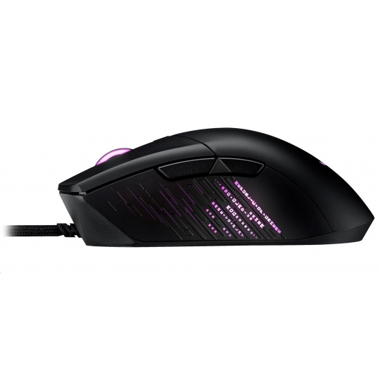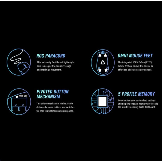 - ROG Micro Switches - Nové ROG Micro Switches majú životnosť 70 miliónov kliknutí a pozlátený elektrospoj na zvýšenie odolnosti. Prísne výrobné štandardy ROG zaručujú, že každý jednotlivý spínač je skontrolovaný a roztriedený, pričom sa spájajú ľavý a pravý spínač, aby sa udržala odchýlka sily v rozmedzí +/- 5 gramov pre konzistentný pocit kliknutia.