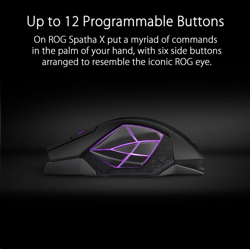 - Až 12 programovateľných tlačidiel - 12 programovateľných tlačidiel na ROG Spatha X vám umožní vykonávať nespočetné množstvo príkazov na dlani, pričom šesť bočných tlačidiel je usporiadaných tak, aby pripomínali ikonické oko ROG. Umiestnenie jednotlivých tlačidiel bolo starostlivo zvážené, aby boli na dosah, a všetky boli navrhnuté tak, aby poskytovali hmatový pocit kliknutia pre intuitívne a citlivé ovládanie.