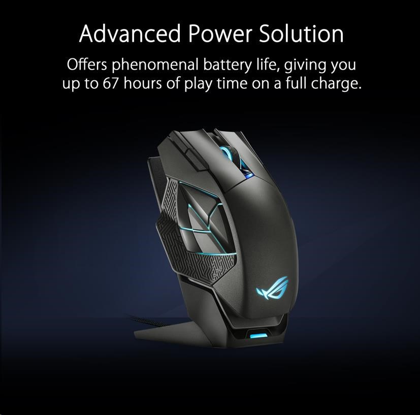 - Pokročilé riešenie napájania - ROG Spatha X ponúka fenomenálnu výdrž batérie, vďaka ktorej môžete na plné nabitie hrať až 67 hodín. A ak sa batéria vybije, stačí 15 minút nabíjania cez USB-C alebo nabíjací dok, aby ste mohli hrať až 12 hodín* intenzívneho bezdrôtového hrania.