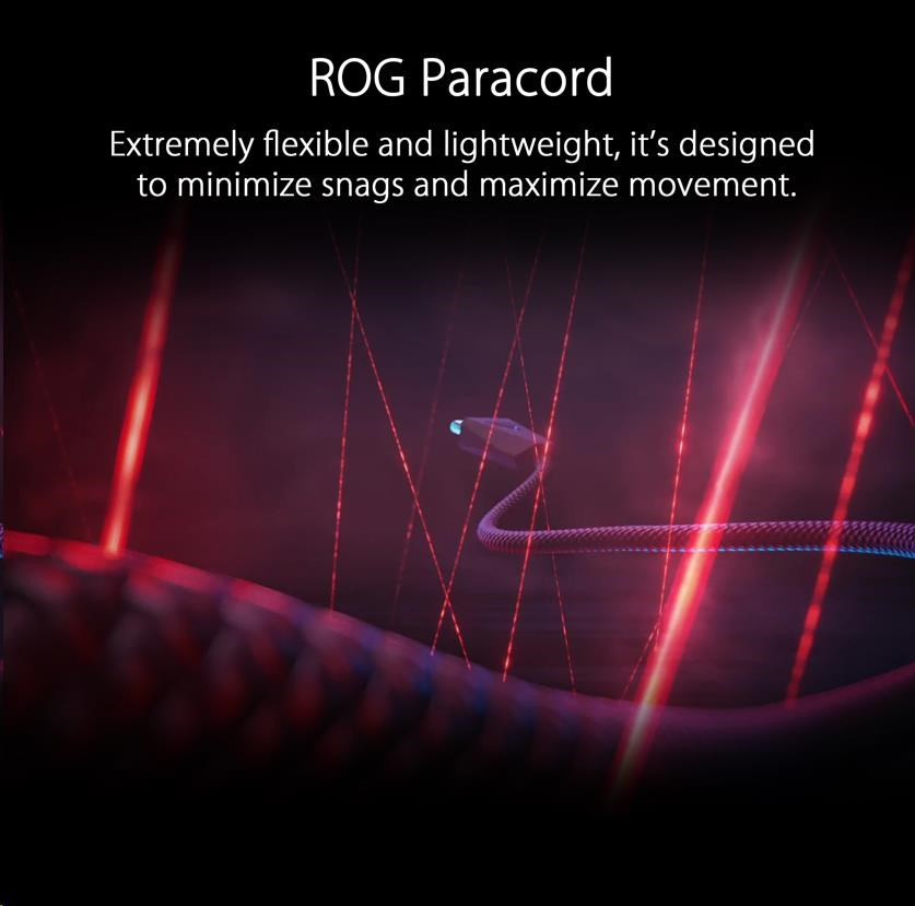 - ROG Paracord - Extrémne flexibilný a ľahký ROG Paracord je navrhnutý tak, aby minimalizoval zasekávanie a maximalizoval pohyb. Vyvýšený port ROG Spatha X poskytuje priestor medzi káblom a povrchom dosky alebo podložky pod myš, čím minimalizuje ťahanie kábla a hluk.