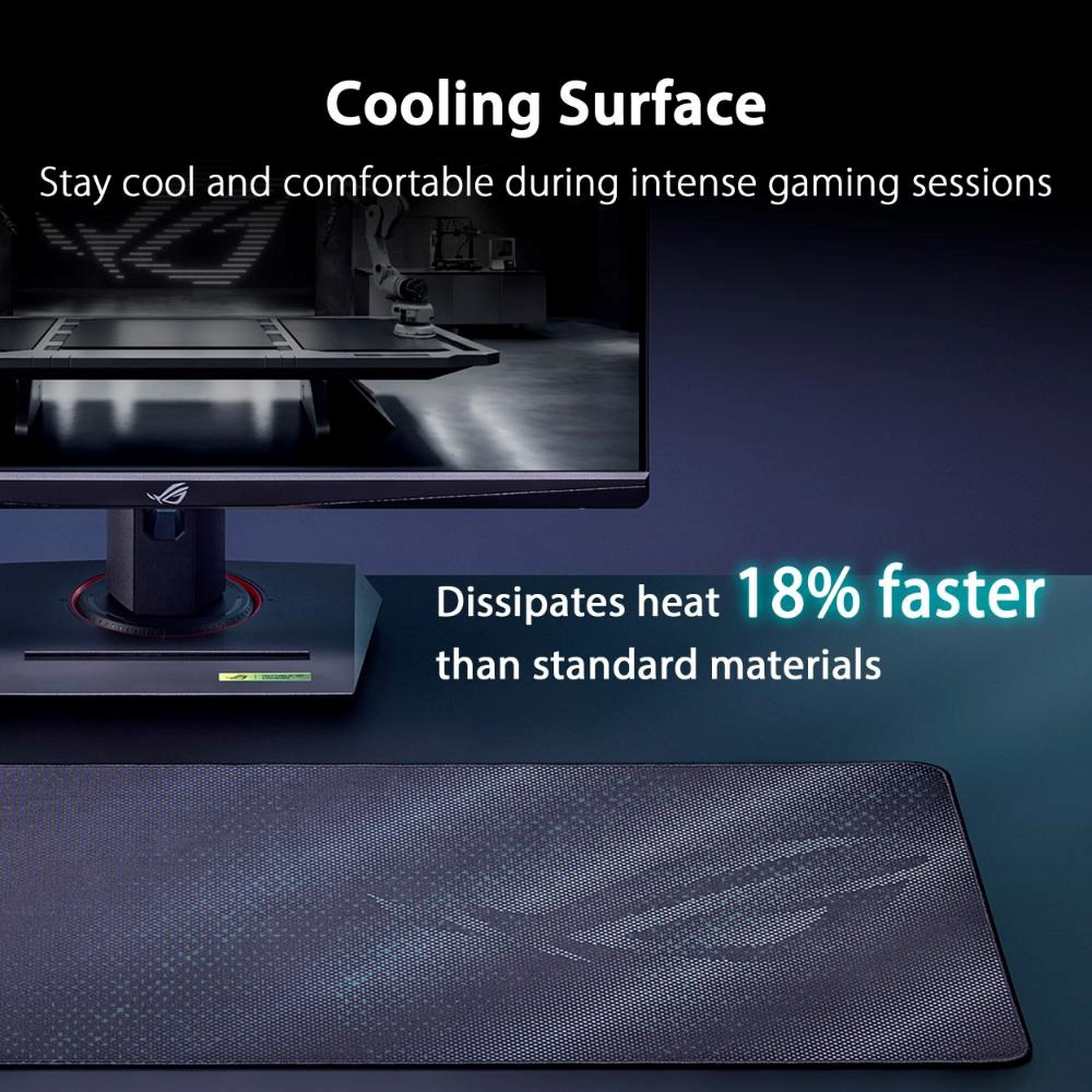 ROG Sheath II XXL je veľká herná podložka pod myš s pokročilou chladicou tkaninou a plochými šiťými okrajmi proti odieraniu a protišmykovou gumovou základňou