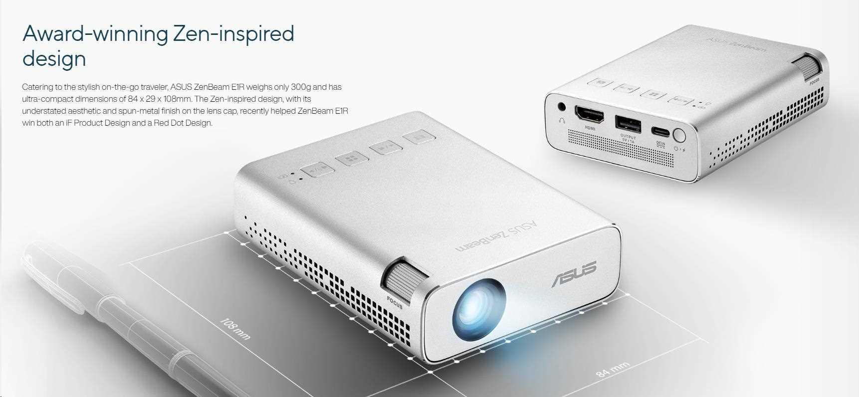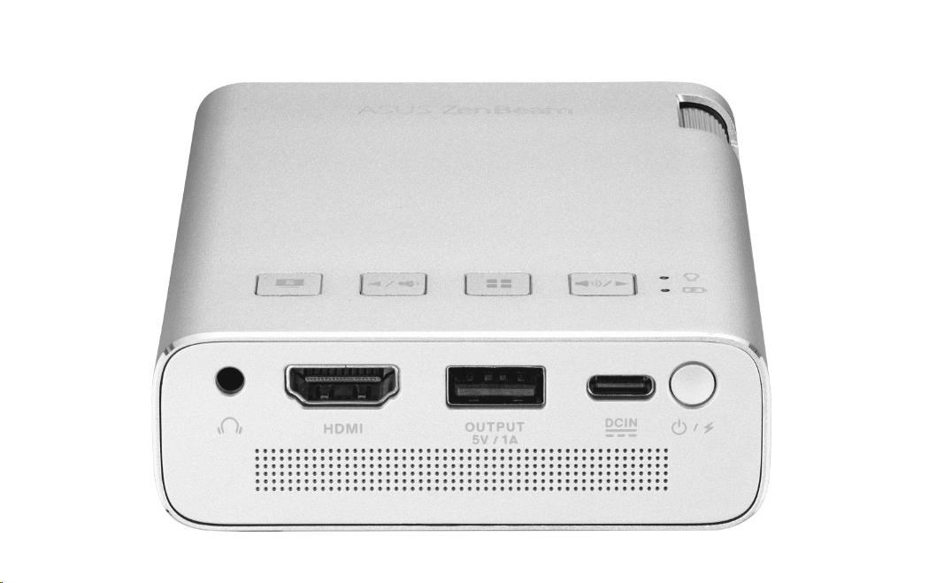 Mini LED projektor ASUS ZenBeam E1R – 200 LED lúmenov, rozlíšenie WVGA (854x480), režim automatickej projekcie na výšku, vstavaná batéria pre až 4-hodinové prenosné prehrávanie videa, powerbanka, USB Type-A, HDMI