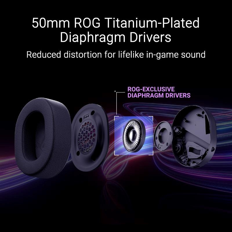 - 50mm meniče ROG s titanovou membránou: Exkluzívne meniče ROG zabezpečujú bohatý, detailný zvuk so širokým frekvenčným rozsahom 20 Hz–20 kHz