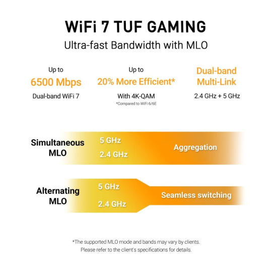 - 4K-QAM & Multi-Link Operation – WiFi 7 dvoupásmový router poskytuje rýchlosť až 6500 Mb/s. 4096-QAM zvyšuje rýchlosť 1,2X a Multi-Link Operation (MLO) zvyšuje stabilitu a efektívnosť pripojenia viacerými pásmami súčasne.