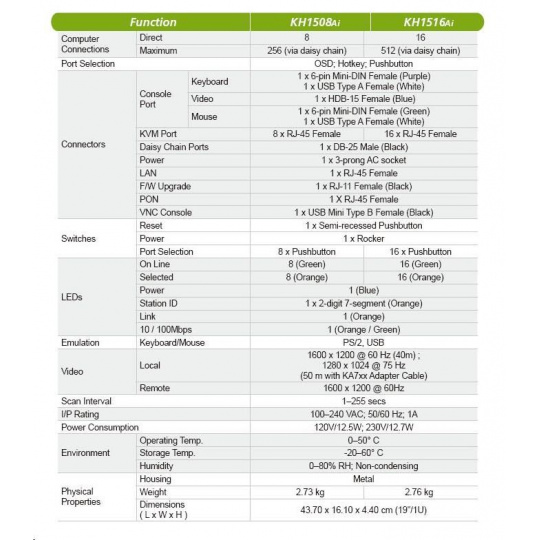 | Porty | pre pripojenie k KVM - RJ-45 pre pripojenie k PC - PS/2(KA-9520 - nutné zakúpiť samostatne) pre pripojenie k PC - USB (KA-7970 - nutné zakúpiť samostatne) |