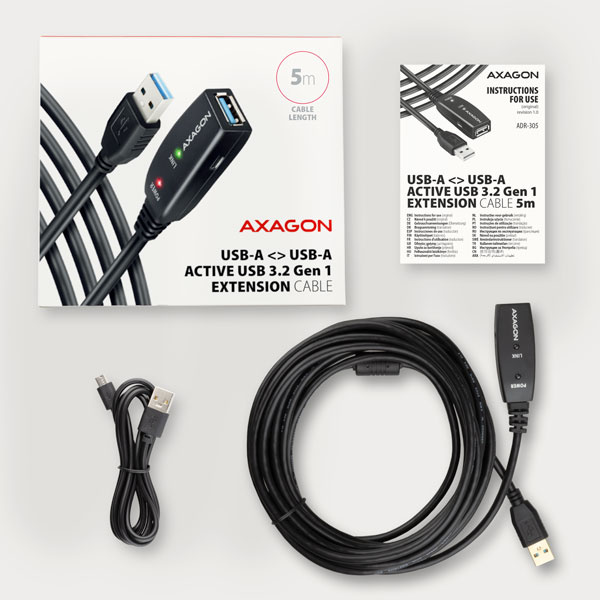 Aktívne rozšírenie Kábel AXAGON ADR-305 USB 3.2 Gen 1 s dĺžkou 5 metrov je ideálny na prepojenie vášho počítača s USB zariadením, ako je myš, klávesnica, webkamera, tlačiareň, skener, ploter a ďalšie. Aktívny kábel USB zosilňuje priechodný signál a umožňuje pripojenie zariadení USB na výrazne väčšiu vzdialenosť, ako umožňuje pasívny kábel. Dosah kábla je možné ďalej rozšíriť použitím niekoľkých káblov za sebou.