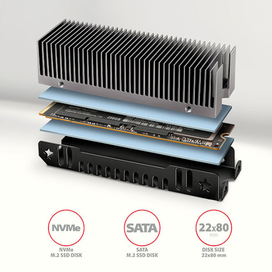 Chladič je možné použiť nielen s adaptérmi AXAGON M.2, ale aj so slotmi M.2 (NGFF) na základných doskách a pod. Vďaka veľkej chladiacej ploche a kovovému rámu efektívne odvádza teplo z oboch strán disku M.2, čím sa dosiahne maximálna účinnosť chladenia. Vďaka vysokej účinnosti chladenia je tento chladič jedným z najvýkonnejších modelov chladičov AXAGON .