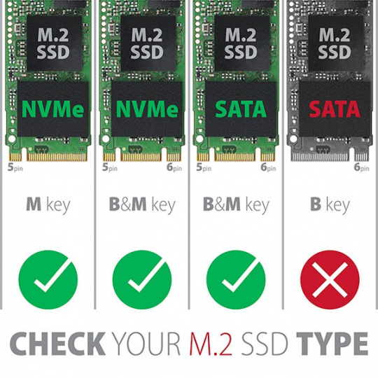 Jedinečnou funkciou vďaka novej čipovej súprave je možnosť používať obe M.2 disky NVMe a SATA. Nemusíte teda premýšľať o tom, aký typ M.2 disky do škatule. Výhodou je, že sa montuje priamo na tri rôzne dĺžky kariet SSD - 42, 60 a 80 mm. M.2 karty môžu byť jednostranné alebo obojstranné. Box nemá obmedzenie kapacity vloženého disku SSD.