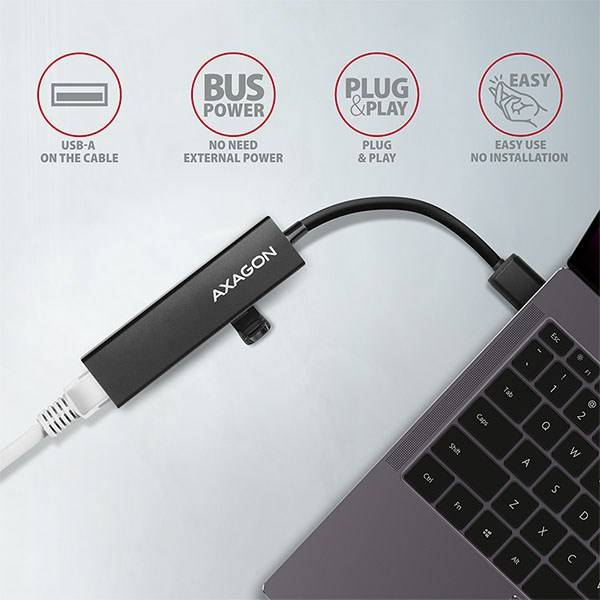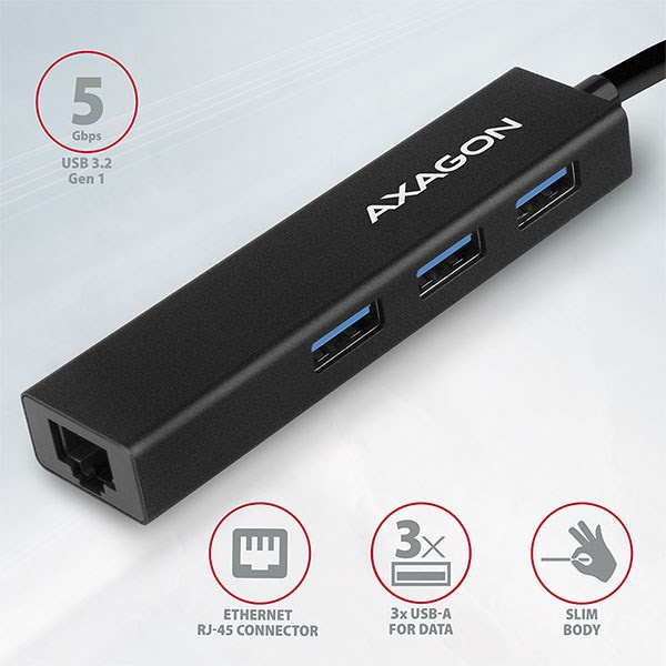 AXAGON HMA-GL3A, USB 3.rozbočovač 2. generácie, porty 3x USB-A + Gigabit Ethernet, kov, kábel USB-A 20 cm