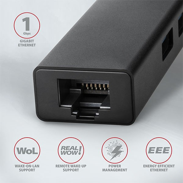 Štíhly kovový USB 3.2 Gen 1 (USB 3.0) Viacportový rozbočovač AXAGON HMA-GL3A nielenže pripojí až tri zariadenia USB súčasne k vášmu notebooku alebo počítaču, ale pridá aj gigabitovú sieťovú kartu na pripojenie počítača k vysokorýchlostnej sieti. Kovové telo rozbočovača je vyrobené z hliníka a poskytuje dokonalú mechanickú ochranu pri častom prenášaní. Elegantný, jemne štruktúrovaný povrch zabraňuje nechceným odtlačkom prstov. 20 cm dlhý pevný kábel USB je ideálny pre používateľov mobilných zariadení.
