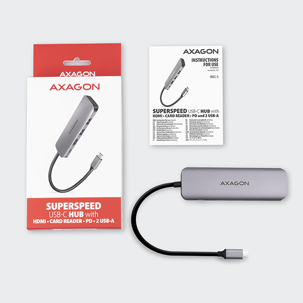Viacportové USB-C 3.rozbočovač AXAGON HMC-5 2 Gen 1 rozšíri váš notebook, počítač alebo telefón o štyri porty a čítačku kariet SD/microSD. Prostredníctvom obojstranného konektora USB-C ľahko a rýchlo pripojíte k počítaču dve zariadenia USB, čítačku kariet a displej HDMI súčasne. Zároveň máte možnosť napájať notebook pomocou technológie Power Delivery. Rozbočovač USB-C poskytuje jednoduchú a skladnú dokovaciu stanicu 5 v 1 pre notebook, ako je MacBook Pro.