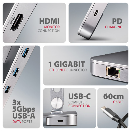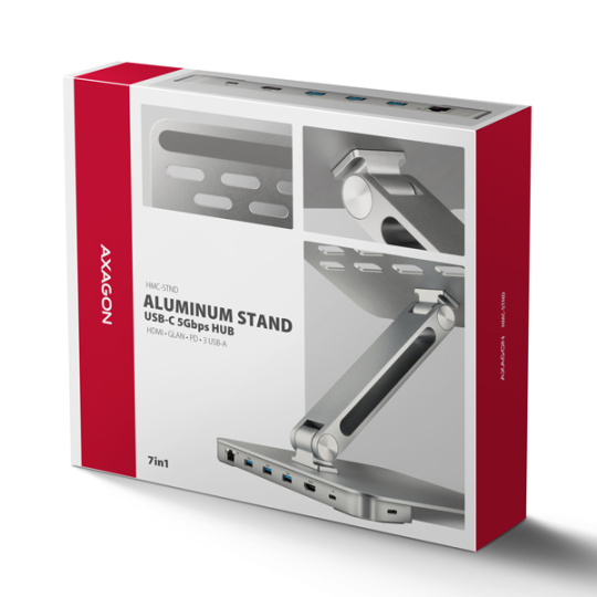 AXAGON HMC-STND 7v1 Hub & Stand je unikátny multifunkčný rozbočovač integrovaný do stojana na notebook alebo tablet. Tento rozbočovač rozšíri váš notebook alebo tablet o ďalších šesť portov. Pripojte svoj notebook k rozbočovaču pomocou 60 cm dlhého kábla USB-C USB-C. Okamžite máte pripojenie pre monitor, tri USB zariadenia, konektor RJ-45 pre sieť Gigabit Ethernet a napájanie notebooku pomocou technológie Power Delivery. Stojan s dvoma kĺbmi zlepšuje ergonómiu a pohodlie pri práci a je vhodný pre zariadenia od 10" do 16". Je ideálny ako dokovacia stanica 7 v 1 pre notebooky so systémom Windows a Apple MacBook Air alebo MacBook Pro.