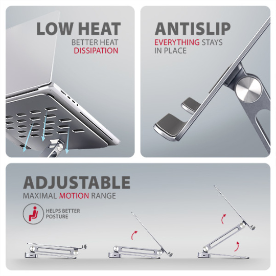 Veľkou výhodou stojana je inteligentné riešenie s dvojitým pántom, ktoré umožňuje nastaviť uhol sklonu a výšku obrazovky notebooku tak, aby bola v jednej rovine s externým monitorom. Získate tak ďalšiu pracovnú plochu v správnej úrovni očí, čo výrazne zlepšuje ergonómiu, zvyšuje komfort pri práci a podporuje vašu produktivitu.